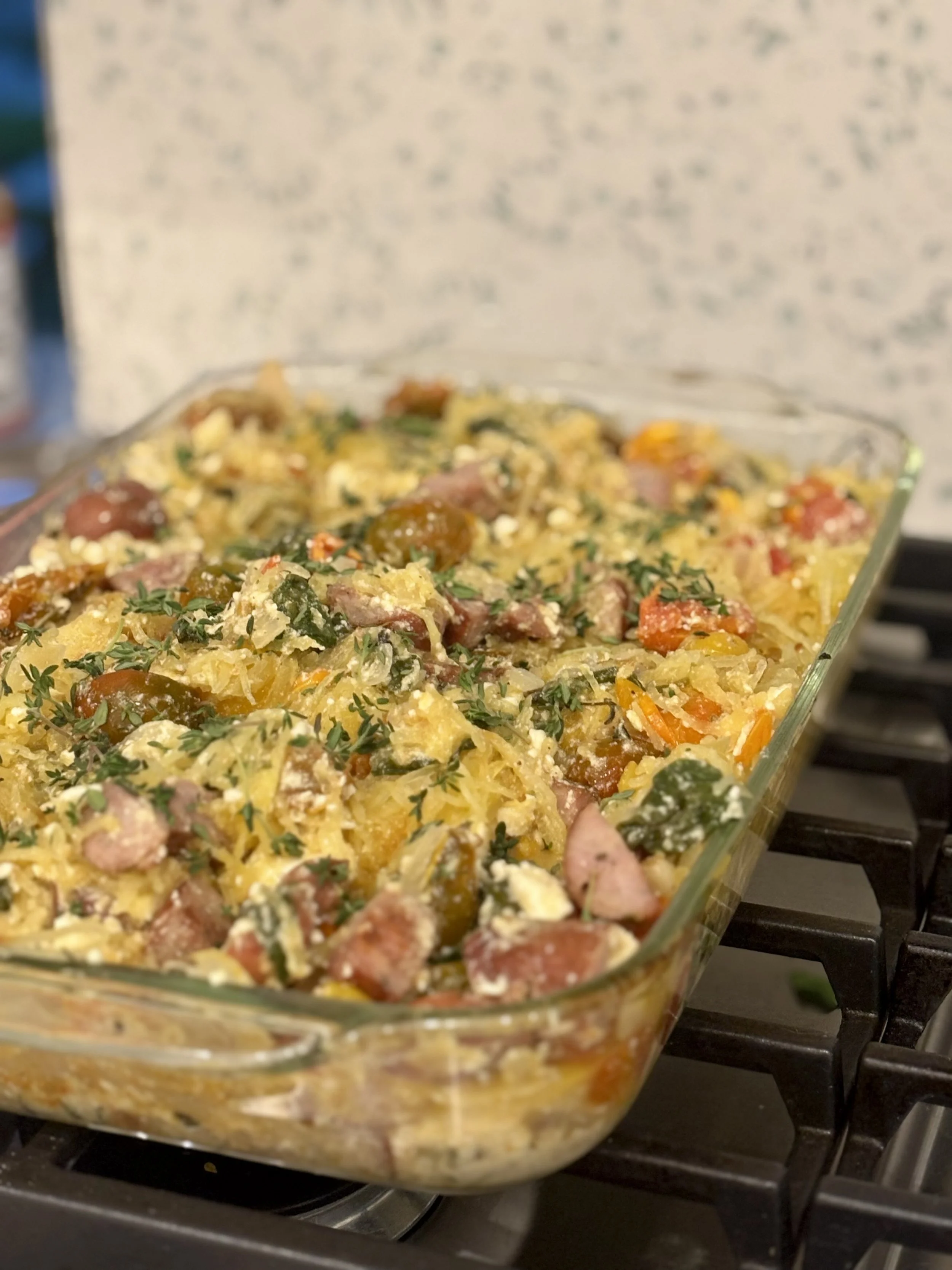 Assemble: Add shredded spaghetti squash to feta, tomato, spinach mixture and stir. Top with sausage and other additional enhancements to serve cheesy low carb goodness.