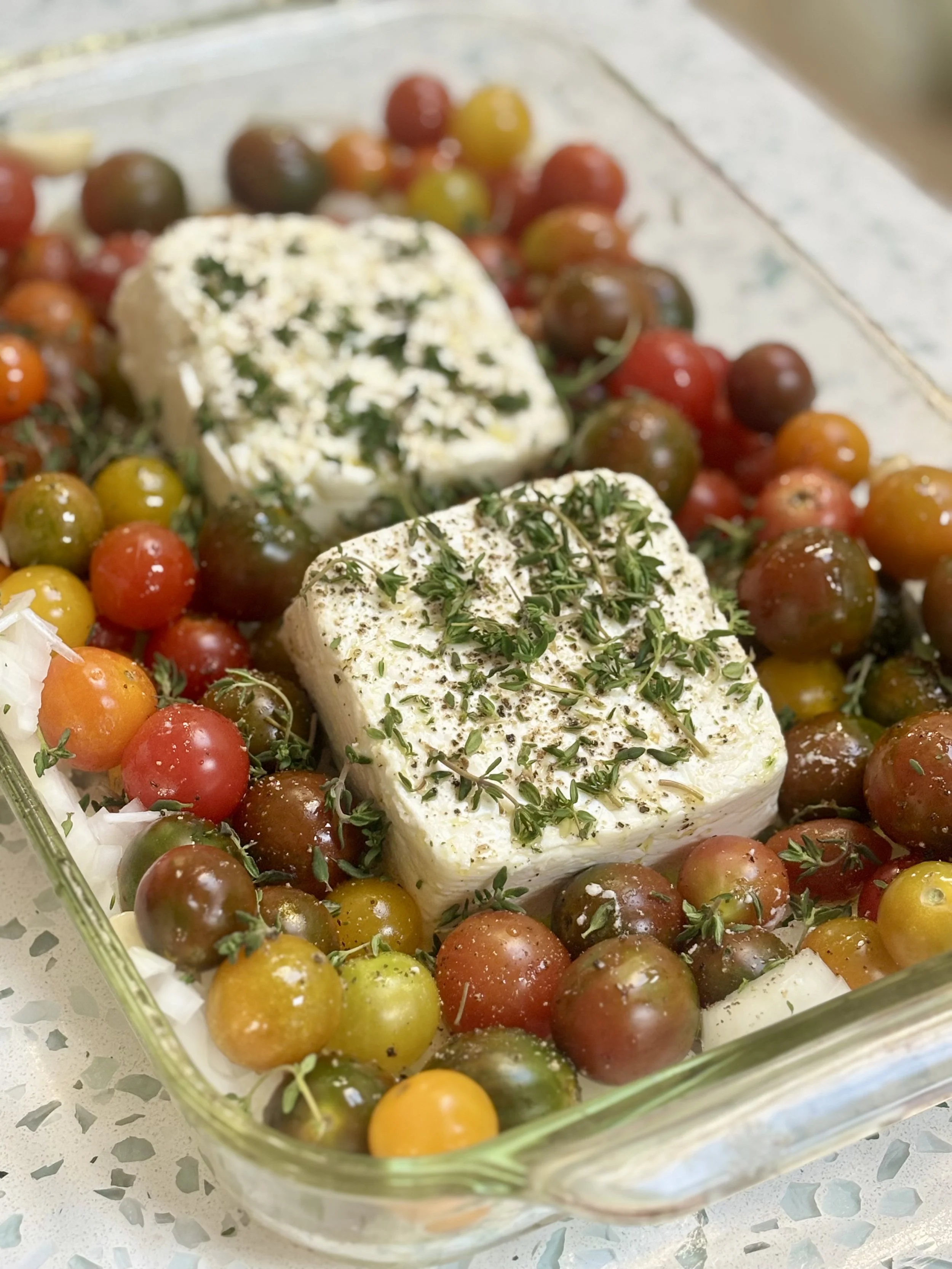 Bake Feta & Tomatoes: Spray large baking dish with avocado oil. Place feta block in center, surround with tomatoes. Top with minced garlic, cracked pepper and thyme. Bake for 40 minutes.